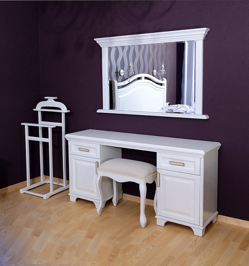 Для доповнення дамського будуару, облаштований в стилі класика або прованс, радимо купити трюмо «Крістіна». Це двотумбове трюмо з рамковими фасадами в італійському стилі, зі зручною місткою стільницею і з великим дзеркалом, яке кріпиться окремо на стіну. Доступно в різному виконанні, включаючи аристократичний білий з золотом.